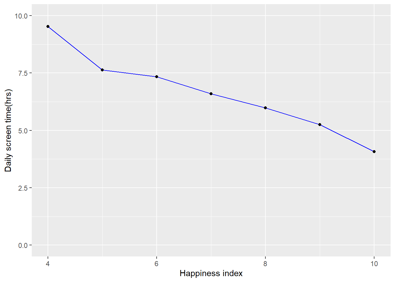 ggplot(data=df5, aes(x=`Happiness_Index(1-10)`, y=`Daily_Screen_Time(hrs)`, group=1)) +