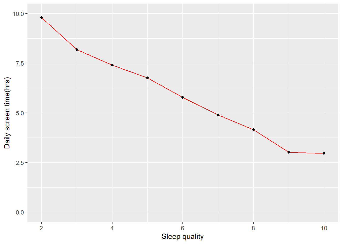 ggplot(data=df3, aes(x=`Sleep_Quality(1-10)`, y=`Daily_Screen_Time(hrs)`, group=1)) +