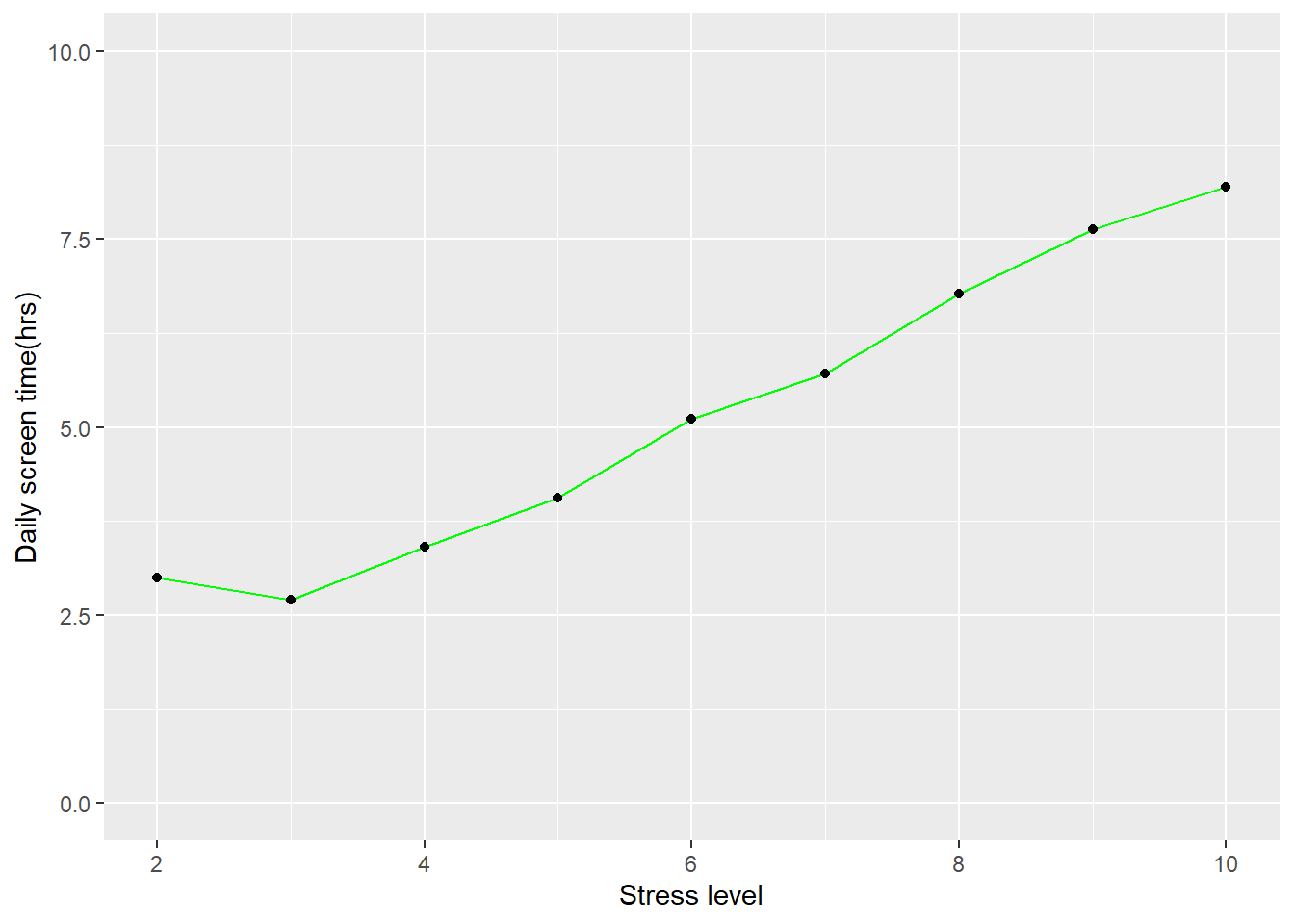 ggplot(data=df4, aes(x=`Stress_Level(1-10)`, y=`Daily_Screen_Time(hrs)`, group=1)) +